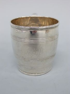A Georgian hallmarked silver tankard with concentric banded decoration, London 1800, maker's mark partially rubbed but very probably John Emes, height 6.6cm, weight 103g