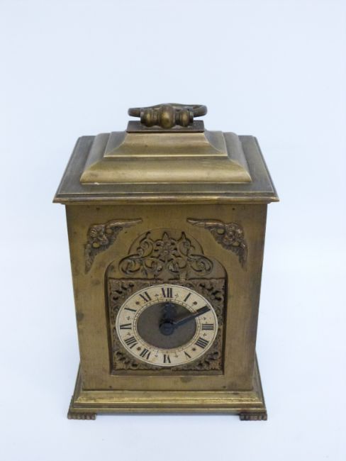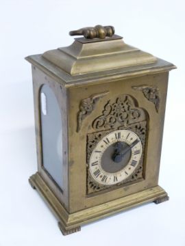 A brass carriage style / bracket clock, the keyless movement stamped Rotherham, England, the dial with Roman silvered chapter ring and foliate spandrels, the case with cherub mark decoration, 21cm tall