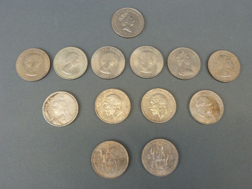 A Victorian 1892 Jubilee crown together with two "rocking horse" examples of 1935, five pound and five shilling crowns, Churchill etc
