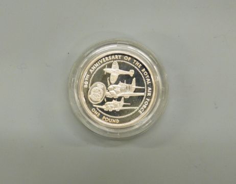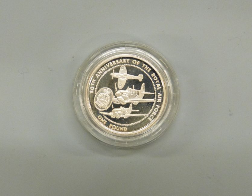 An 80th Anniversary of the Royal Air Force 1998 silver proof Guernsey one pound coin, together with a 1997 Queen's Golden wedding example, with certificates