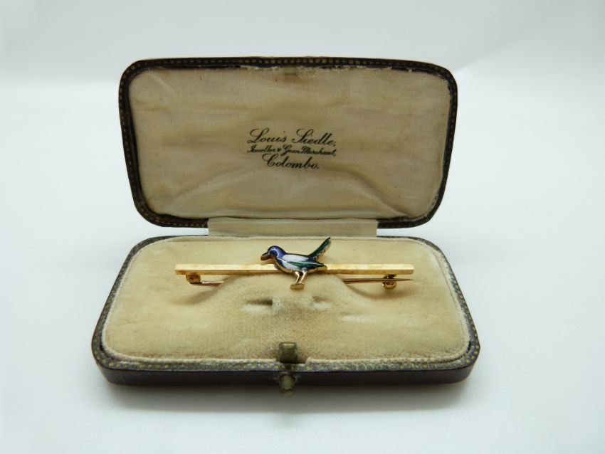A Victorian brooch in the form of a magpie set with enamel, 5cm, 4.6g