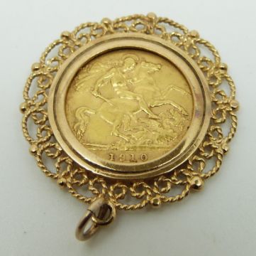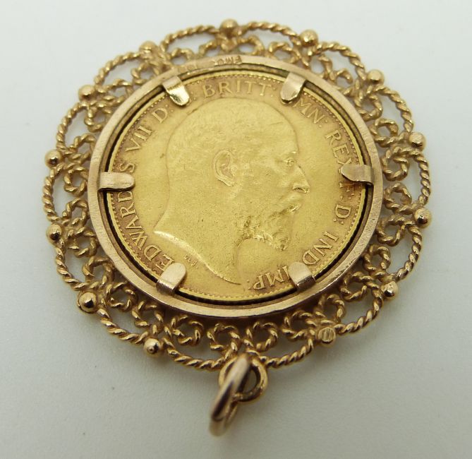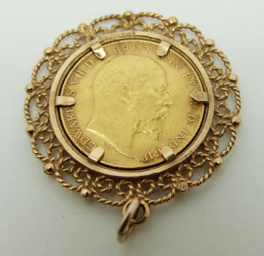 A 1910 gold half sovereign in 9ct gold mount, 7.1g