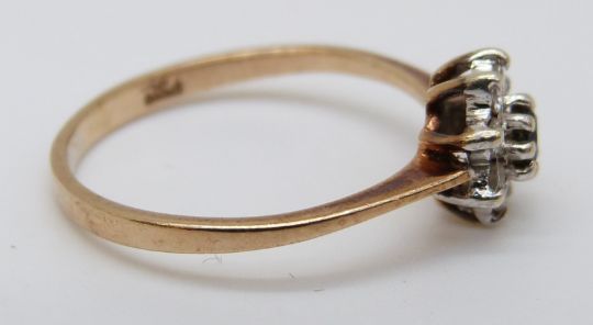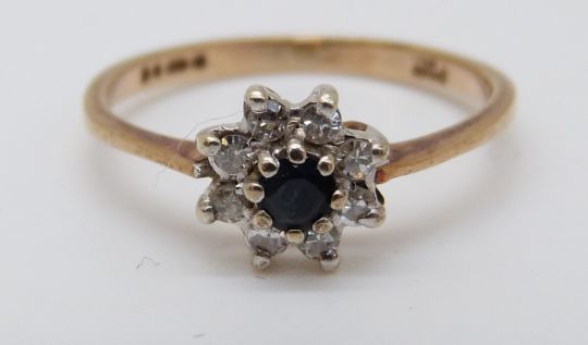 A 9ct gold rings set with a sapphire surrounded by diamonds in a cluster (size I)