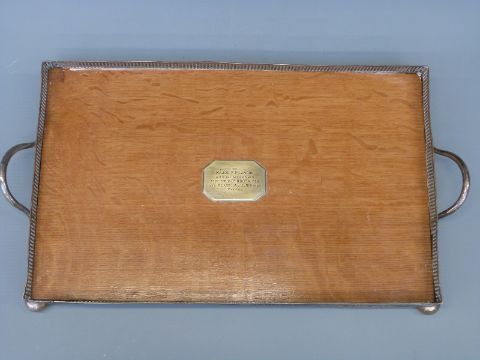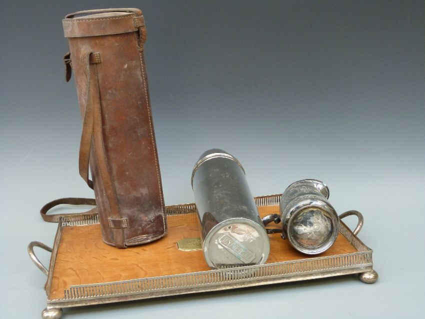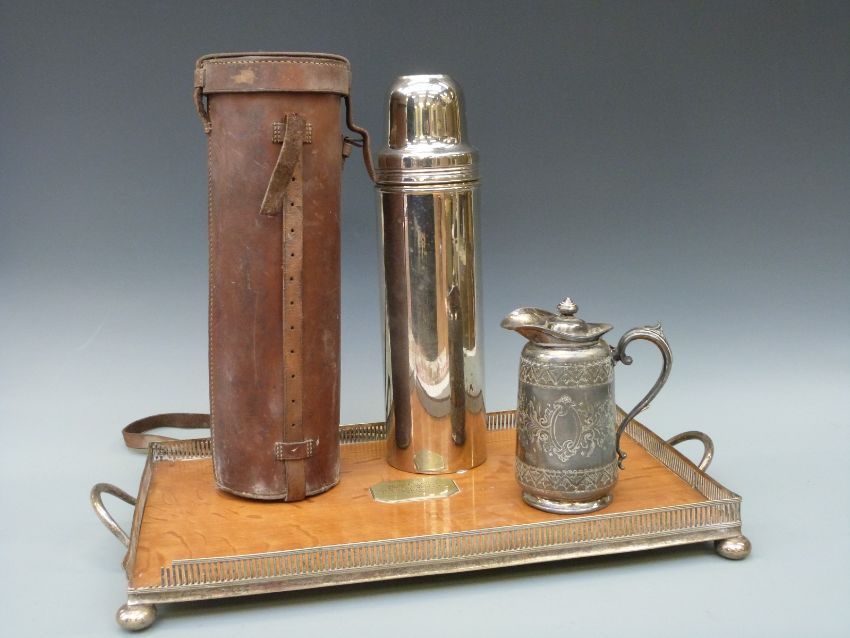 A leather cased Landers Frary & Clark 'Universal' hunting or motoring flask, height 36cm, galleried tray, length 53cm and a plated jug