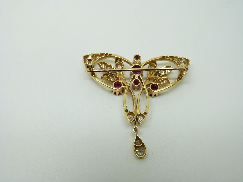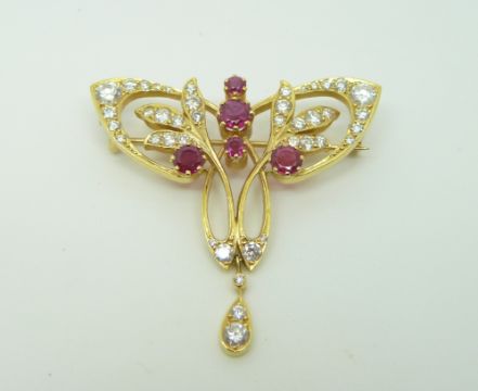 An 18ct gold brooch set with diamonds and synthetic rubies in the Art Nouveau style by T.O.D, 3.8 x 3.5cm