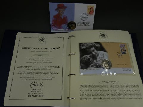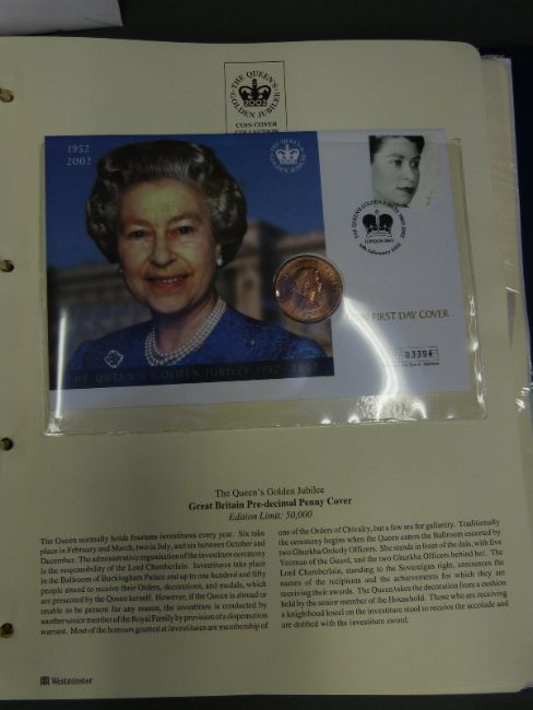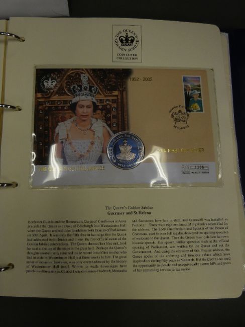 A Queens Golden Jubilee 2002 folder containing 14 crown and stamp covers, includes £5 examples.