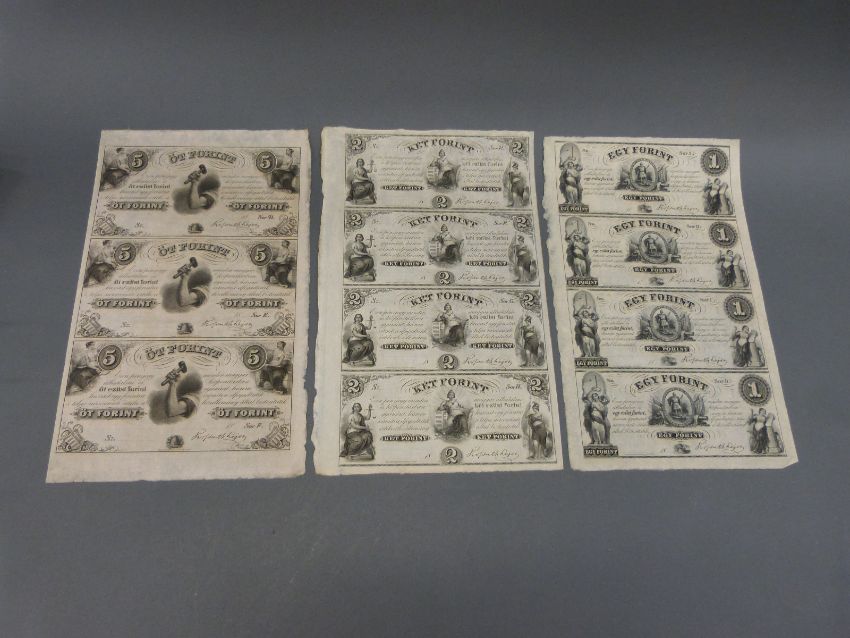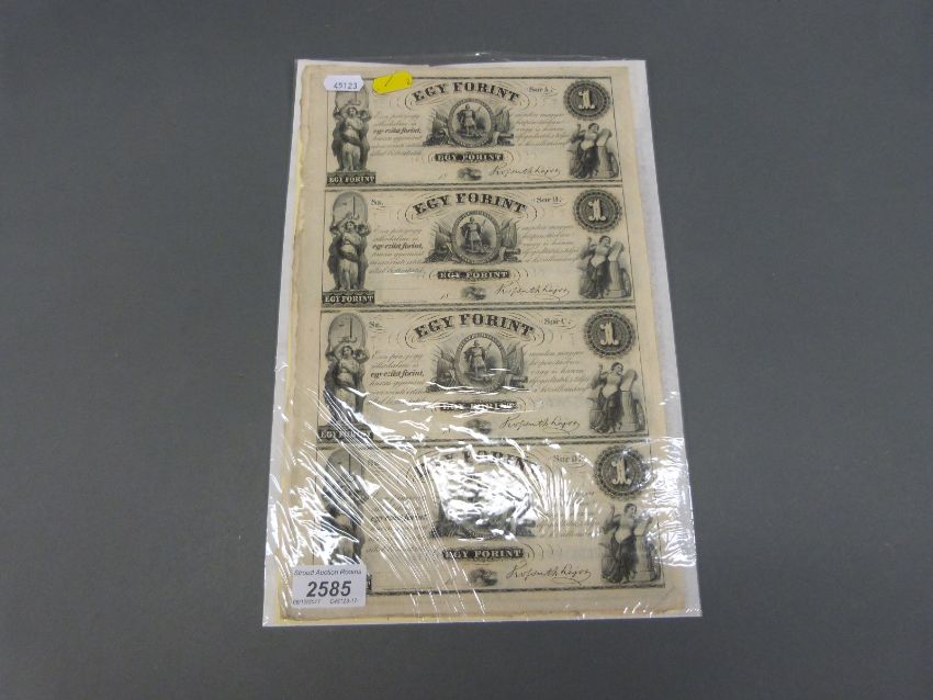 Uncut sheet of four 5 dollar Forint banknotes issued to finance the Hungarian Rebellion of 1956, together with a sheet of 2 dollar examples