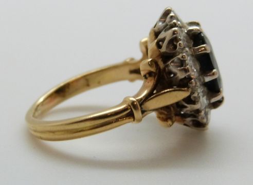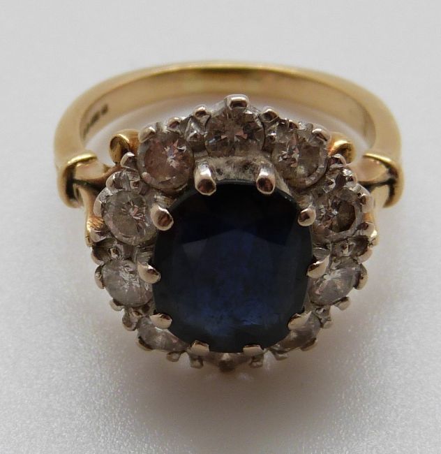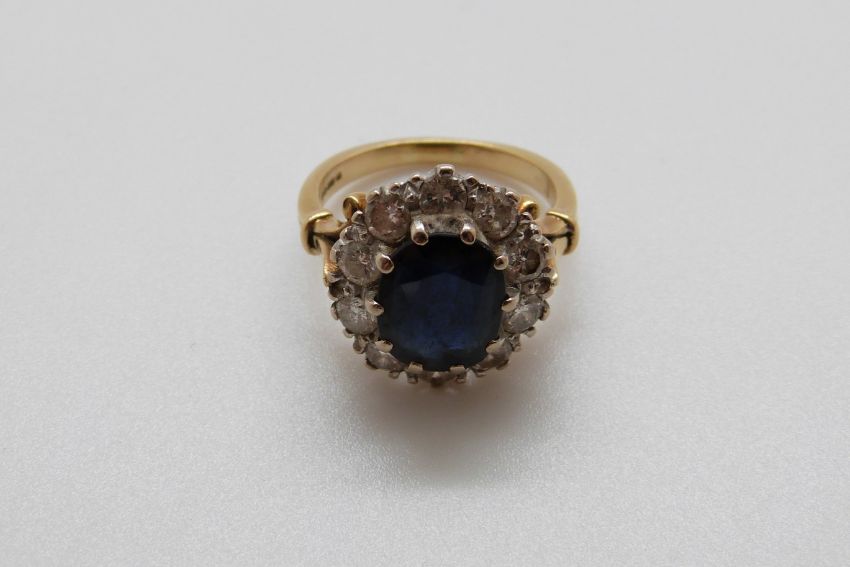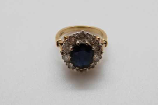 An 18ct gold rings set with a sapphire of approximately 2.35ct surrounded by diamonds, each approximately 0.1ct (size K/L)