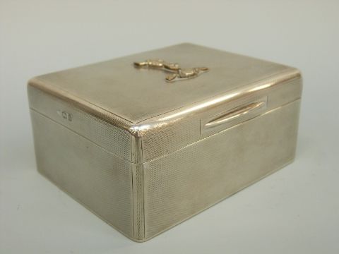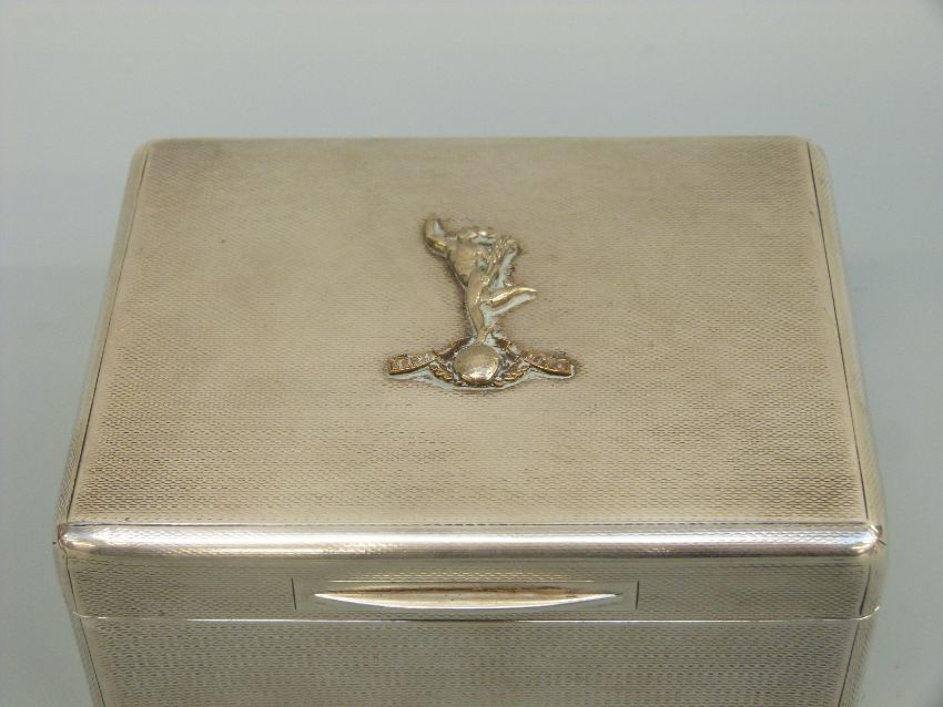 A George V hallmarked silver engine turned Royal Signals interest cigarette box, London 1928 maker Padgett & Braham, width 11.5cm