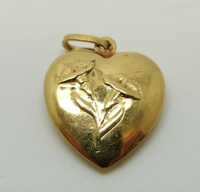 An 18ct gold heart pendant with embossed flower decoration, 1.9g