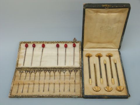 A cased set of six French silver gilt and ivory cocktail stirrers and cased set of twelve white metal cocktail sticks with cockerel finials and six further cocktail sticks marked sterling silver