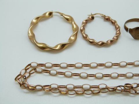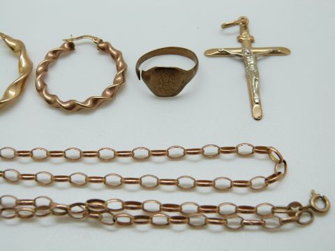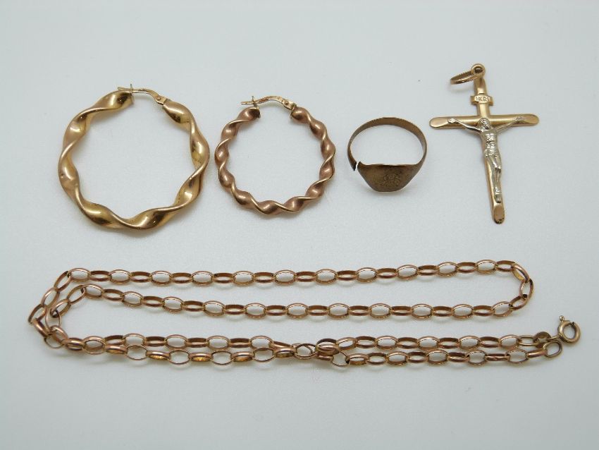 A 9ct gold belcher chain, 9ct gold earrings and a 9ct gold cross, 6.9g