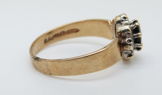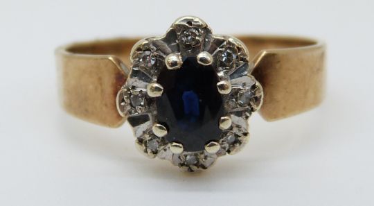 A 9ct gold ring set with a sapphire surrounded by diamonds (size M)