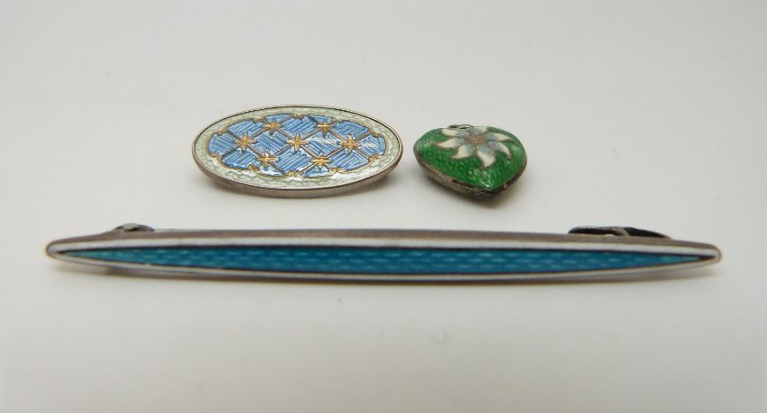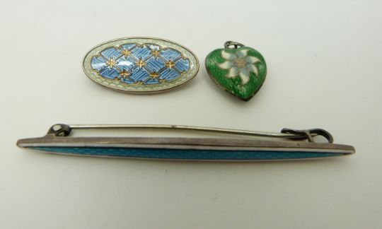 A hallmarked silver brooch, further silver brooch and a silver heart pendant all set with enamel