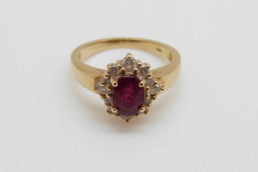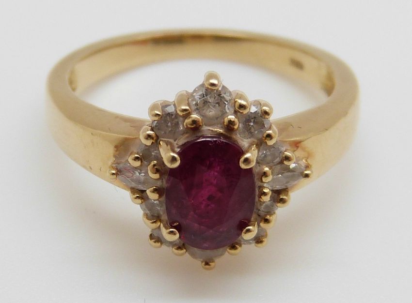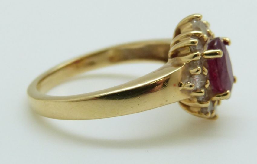 An 18ct gold ring set with an oval cut ruby of approximately 0.75ct surround by diamonds, 4.4g, size L