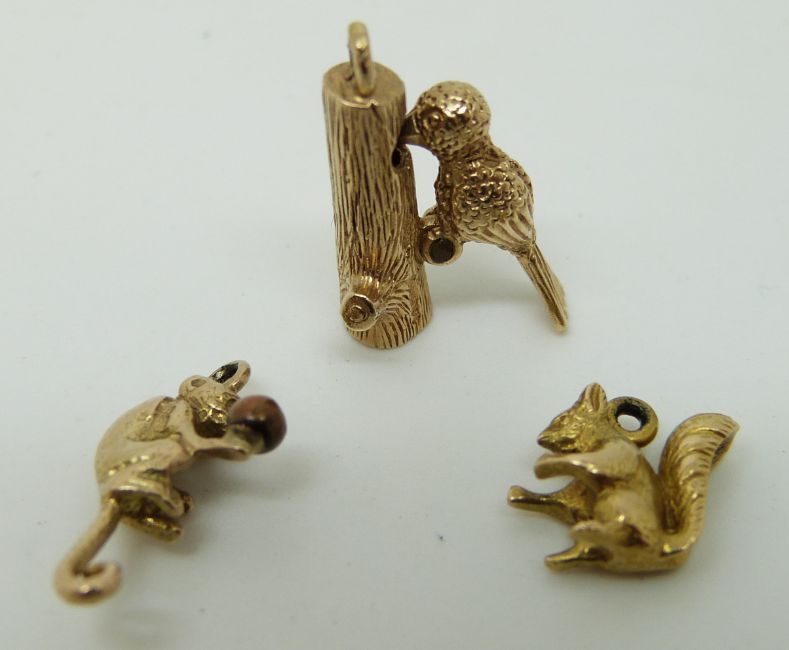 Three 9ct gold charms including woodpecker, squirrel and monkey, 7.1g
