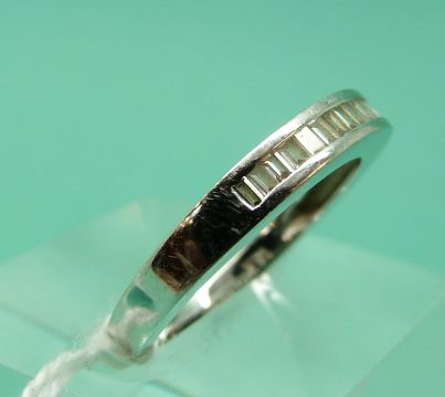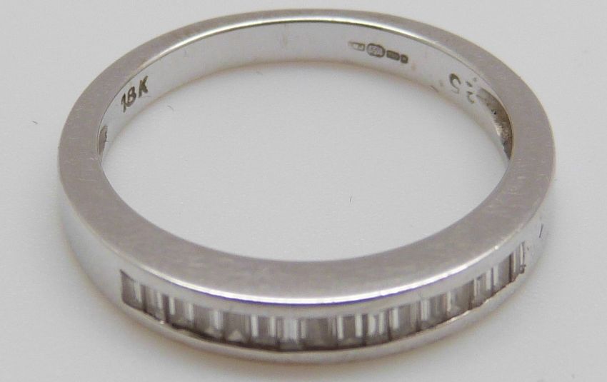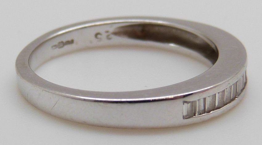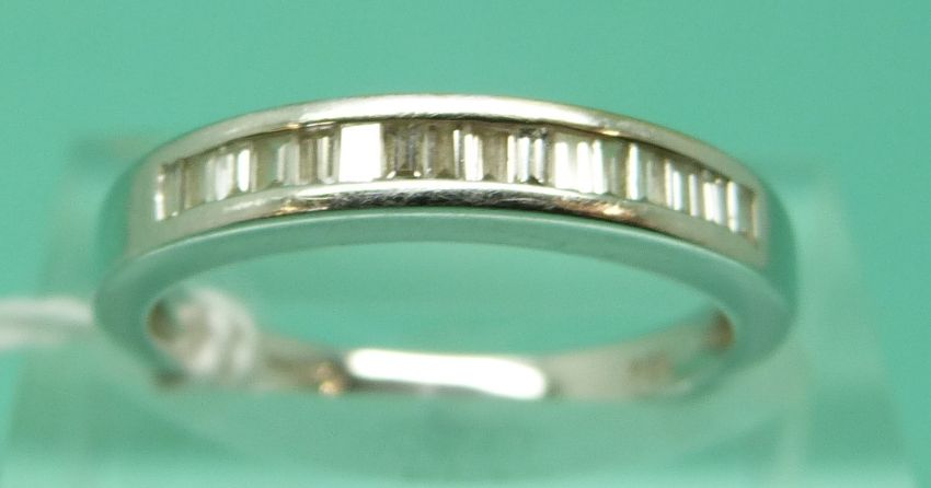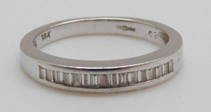 An 18ct white gold ring set with baguette cut diamonds, total diamond weight approximately 0.25ct, 3.1g (size L)