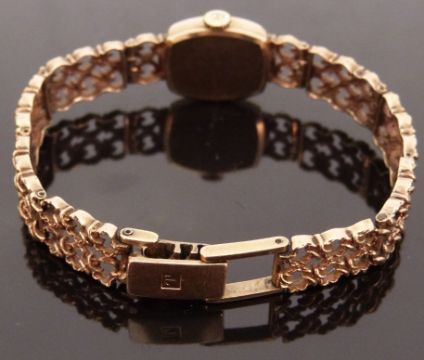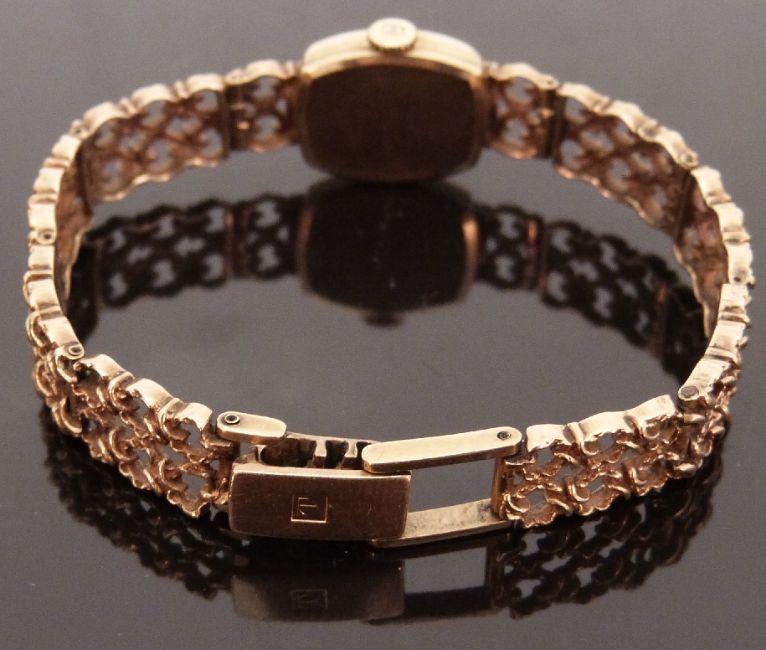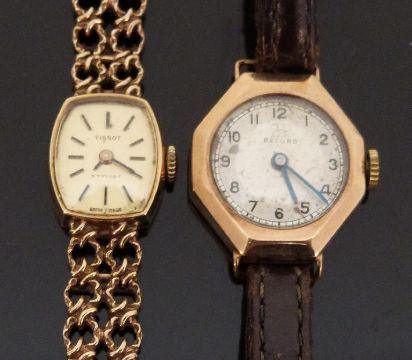 Two 9ct gold ladies wristwatches comprising a Record wristwatch on brown leather strap and a Tissot Stylist wristwatch on integral 9ct bracelet.