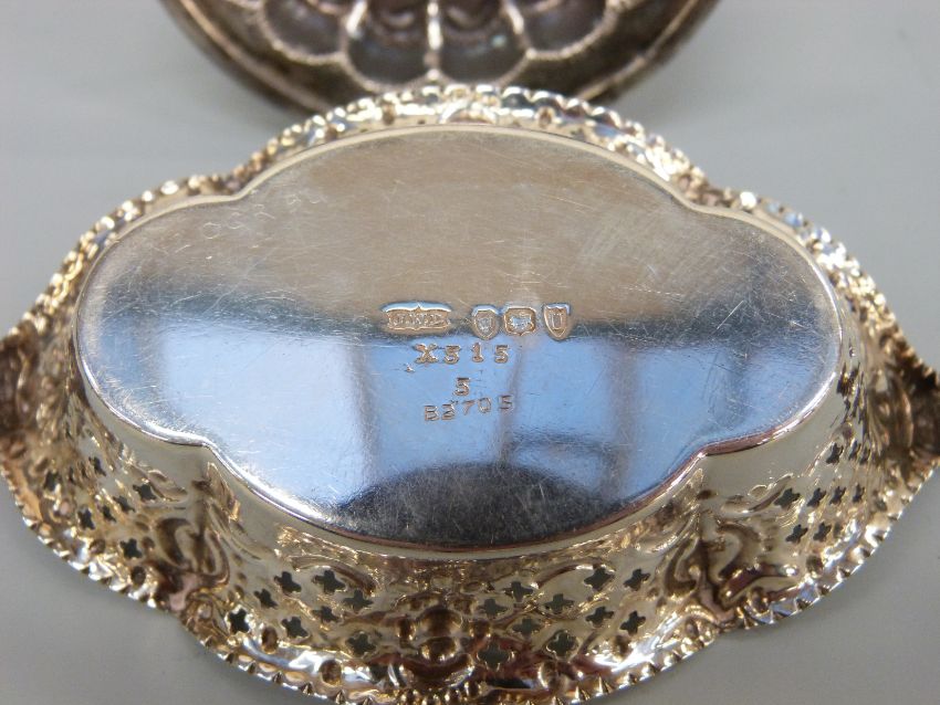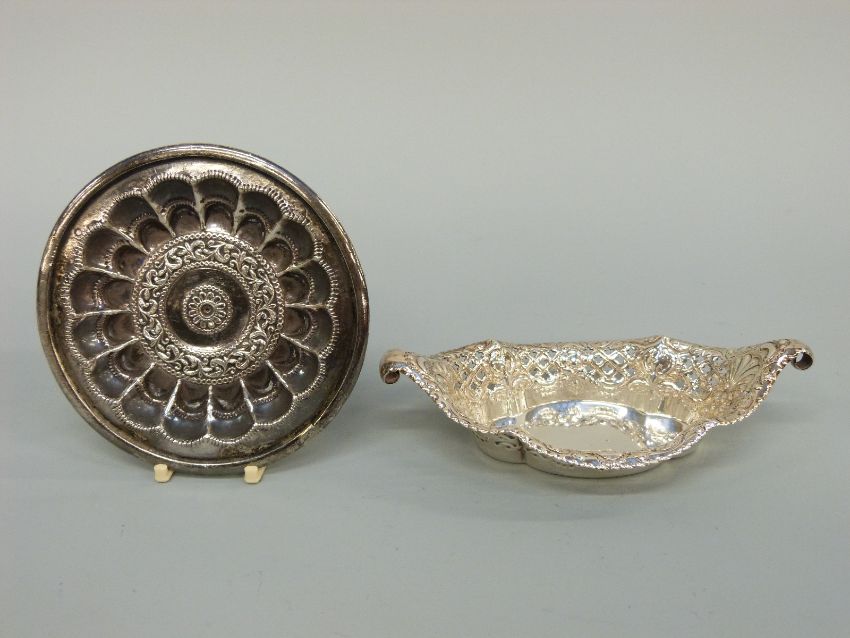 A Victorian hallmarked silver pierced bon bon dish of boat form, London 1895 maker James Dixon & Sons, length 12.5cm, weight 51g together with an unmarked white metal pin dish with lobed interior