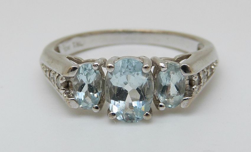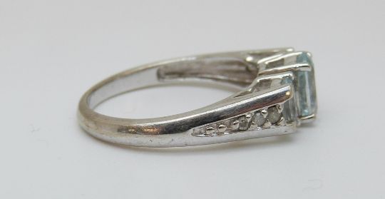 A 10K white gold ring set with blue topaz and diamonds to the shoulders (size N)