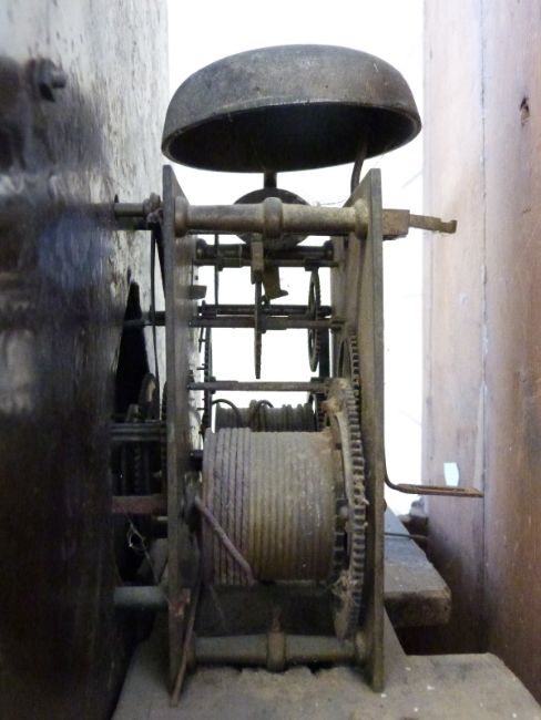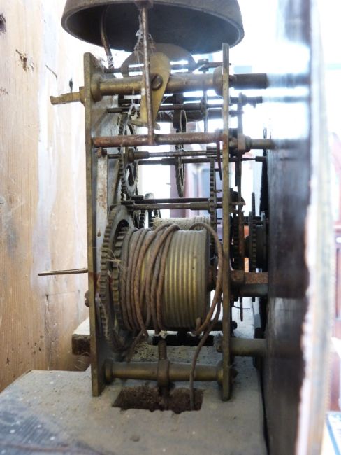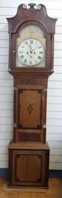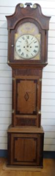 Spurrier, Tewkesbury 8 day duration long cased clock, the 13 inch convex painted Roman dial with two Arabic secondary dials for seconds and date, gilt bezel mounted on dual surround, painted with floral and foliate gilt decoration, the arch with further decoration and maker's name, the matching filigree hands for time and dials. The oak and mahogany case with reeded quarter columns and brass capitols, the hood with swan neck pediments standing 224cm tall