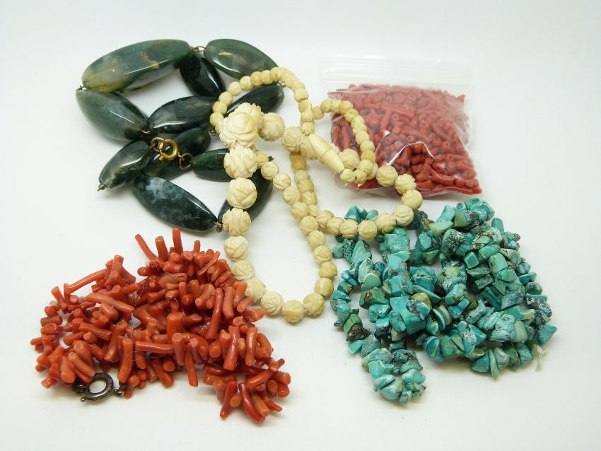 A coral necklace, turquoise necklace, moss agate necklace and a bone necklace