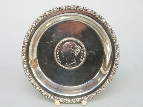 A white metal dish set with an 1840 Rupee, marked silver to rim, diameter 9.5cm, weight 71g
