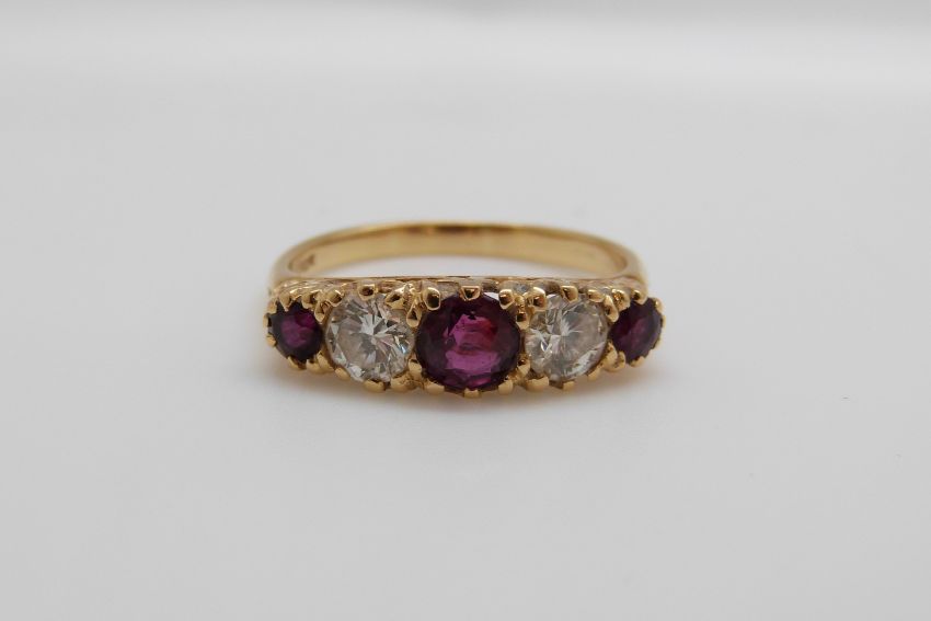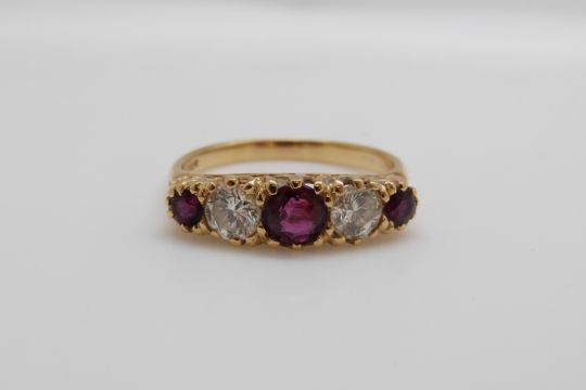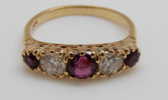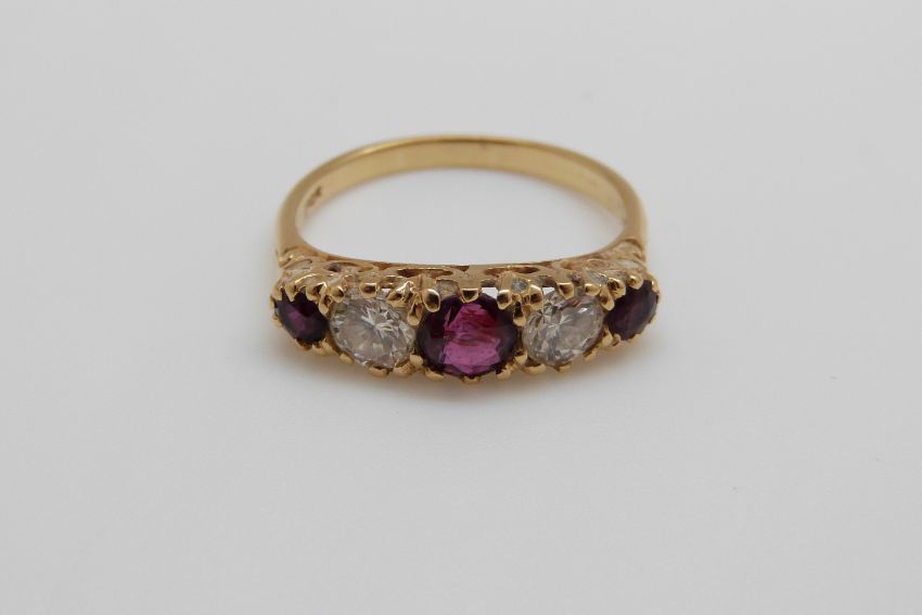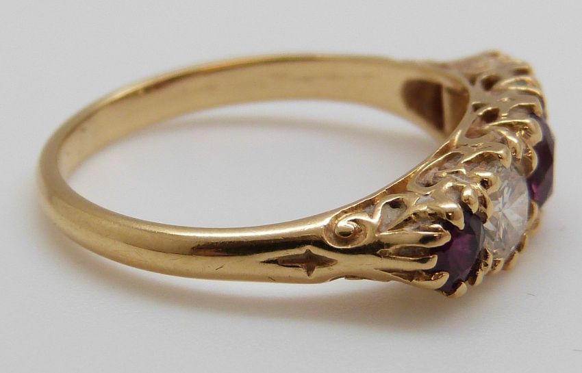 An 18ct gold ring set with three rubies the largest approximately 0.7ct and two diamonds approximately 0.43ct each, 4.2g, size Q