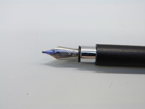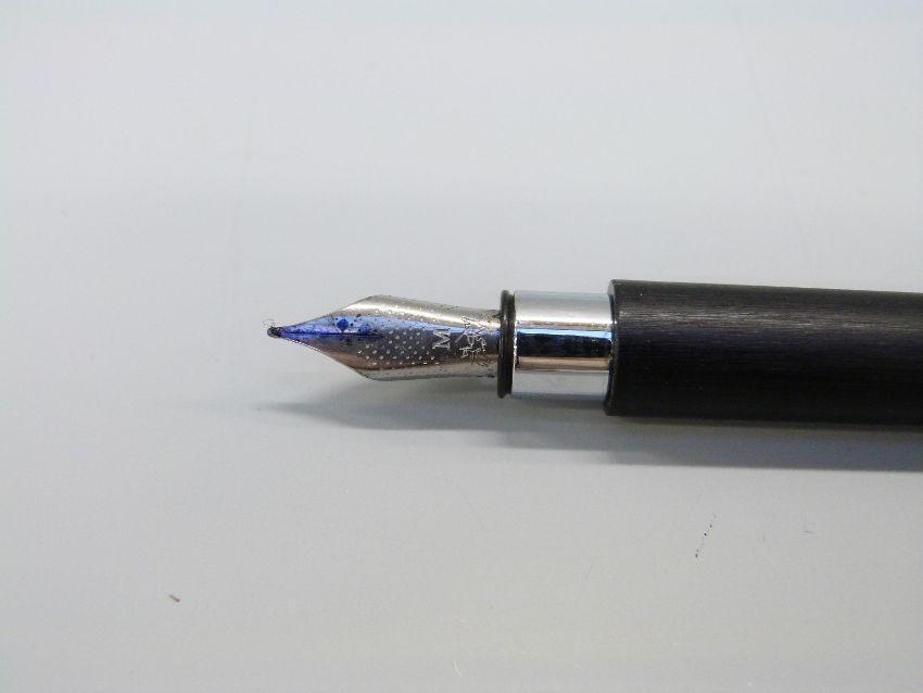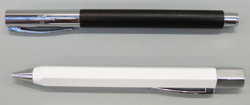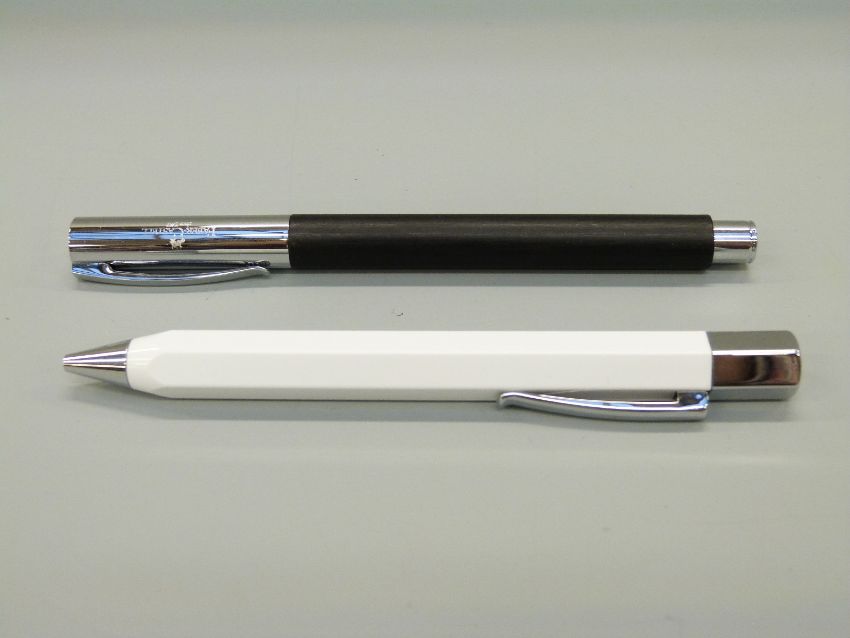 Two Faber Castell pens Ambition fountain pen with black ash barrel chrome cap, clip and fittings and engraved medium nib (14cm long) and a Ondoro ballpoint pen with white hexagonal barrel and chrome fittings (13cm long).