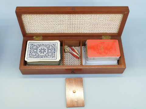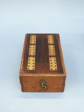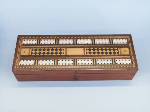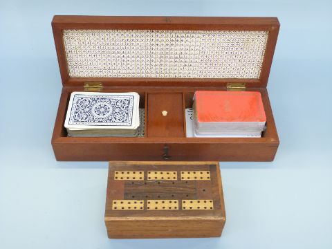Two inlaid cribbage boards, the largest with cards, both with markers and dice, largest 28cm long