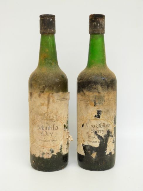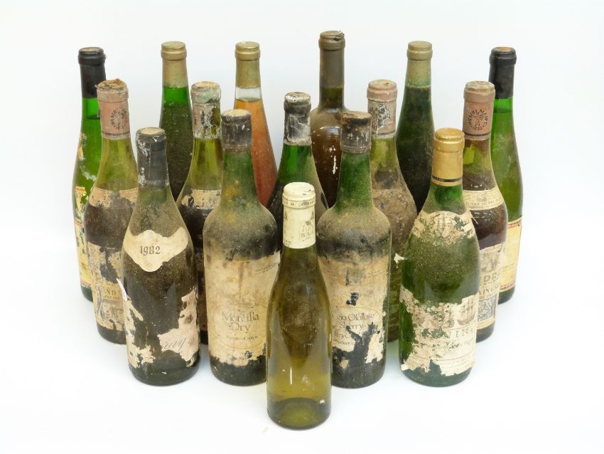 Sixteen bottles of vintage wines, some with missing labels, includes several bottles of Grand Vin Henri Maire, Oloroso sherry, 1982 white wine, rosé d'anjou, Chablis Vaillon etc