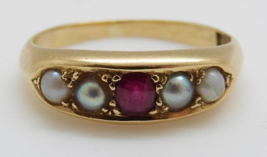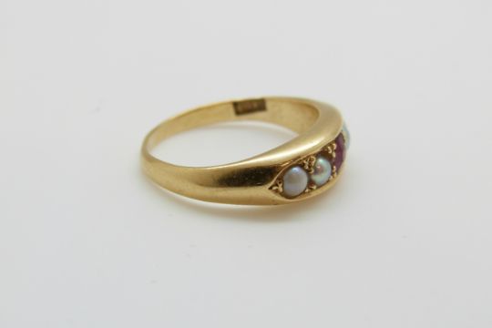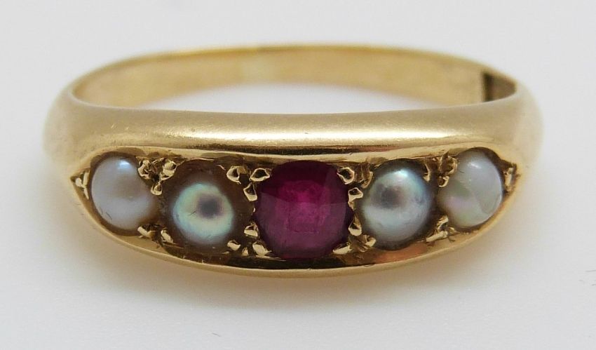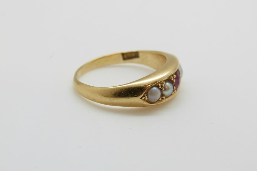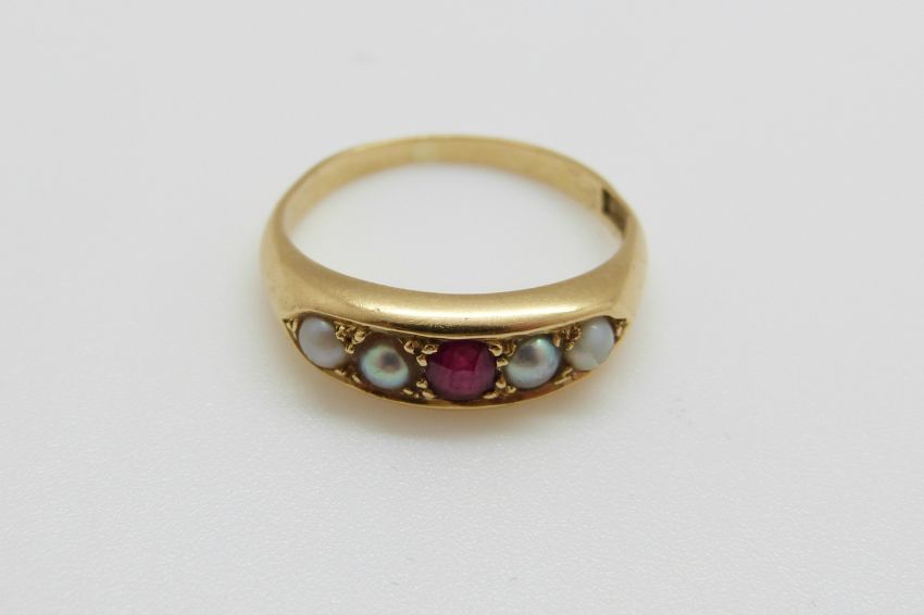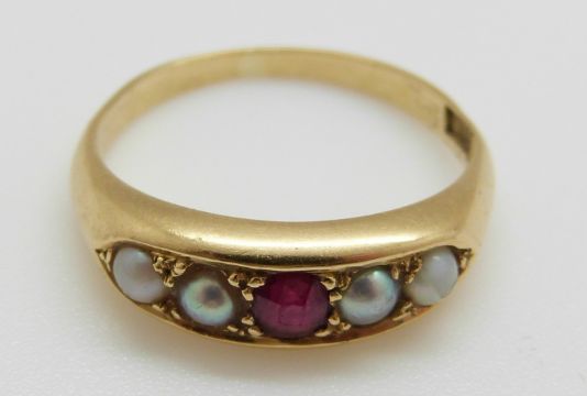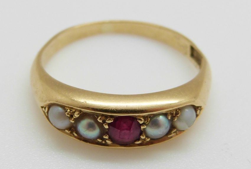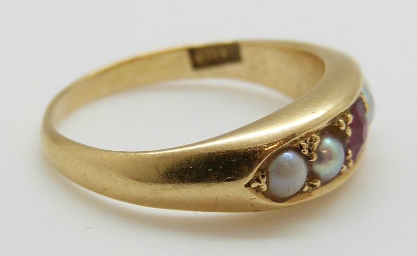 An 18ct gold ring set with a ruby and pearls, 3.8g, size J