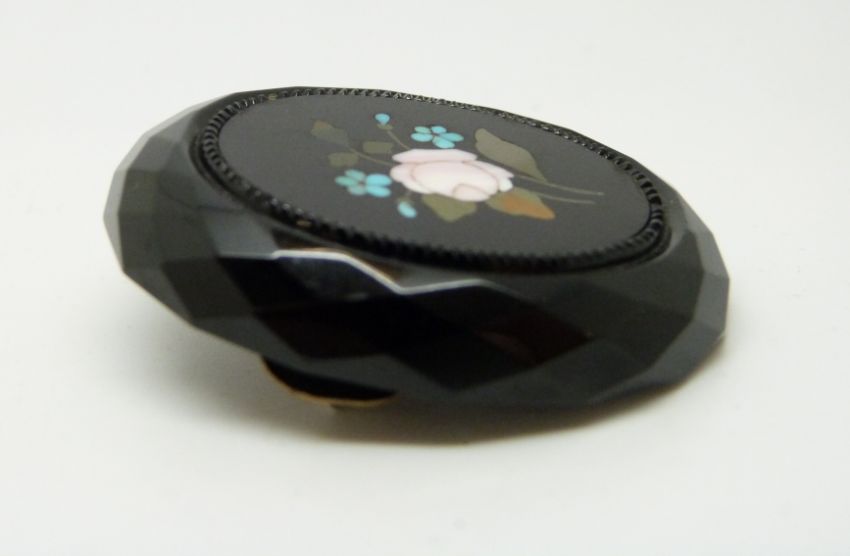 A faceted French jet brooch set with a pietra dura plaque, 4.5 x 3.5cm