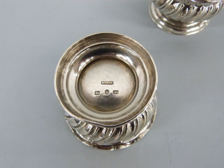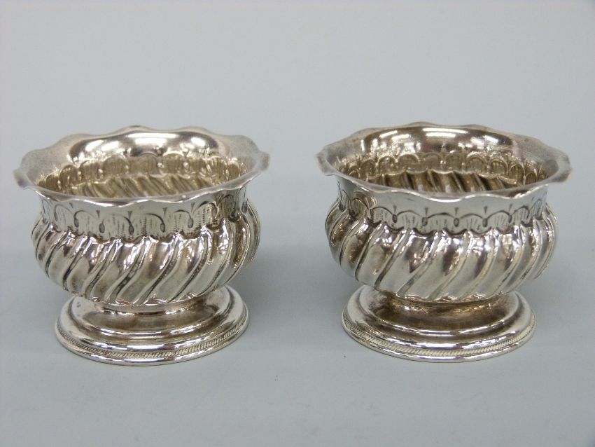 A pair of Victorian hallmarked silver pedestal salts with wrythen decoration and crimped rims, Birmingham 1890 maker Barnet Henry Joseph, weight 35g
