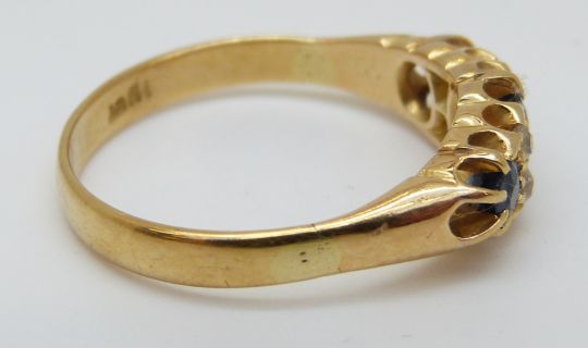 An 18ct gold ring set with three sapphires the largest approximately 0.3ct and four diamonds (size Q)