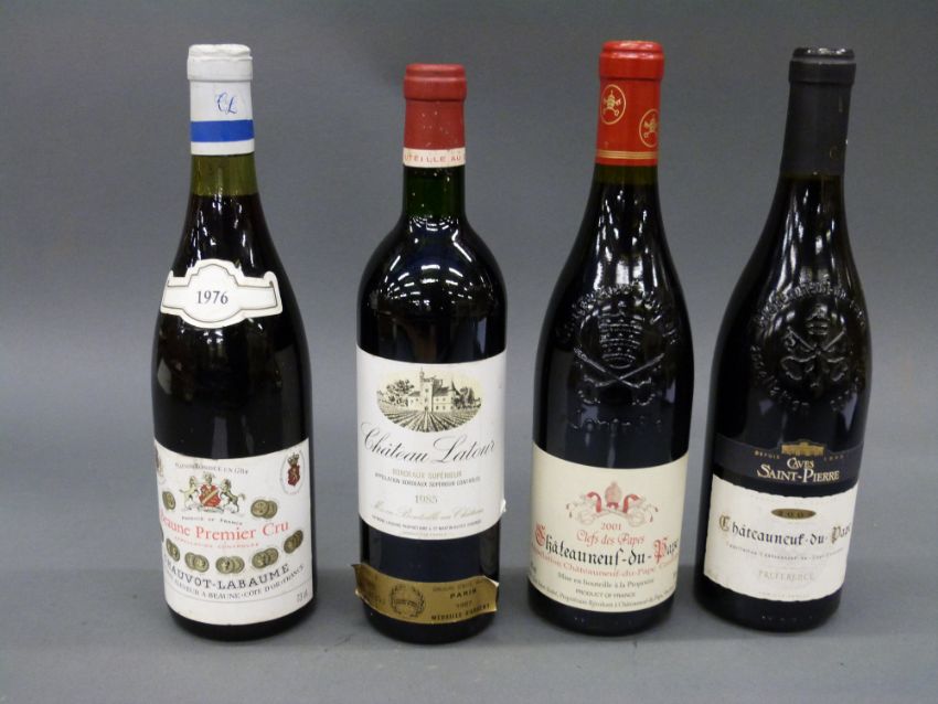 Four bottles of wine comprising Châteauneuf-du-pape 2001 and 2005, Chateau Latour 1985 and a Beaune Premier Cru 1976 Chauvot-Labaume, all but last 75cl