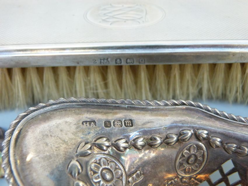 A hallmarked silver pierced bon bon dish, length 14cm, weight 56g, hallmarked silver topped dressing table pot, silver mounted leather purse, three piece silver mounted dressing table set and various silver plate including cigarette case