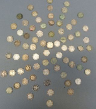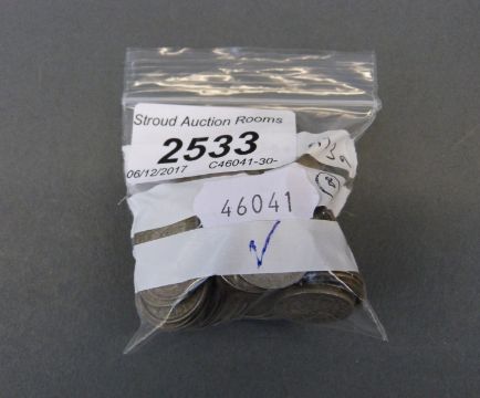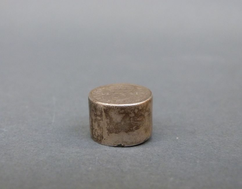 A collection of silver threepenny coins, including a curious sealed cylinder made from 3d pieces, 105g in all