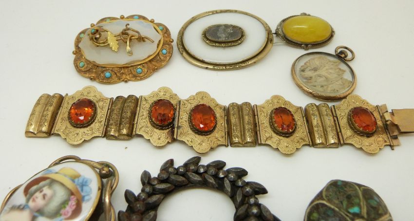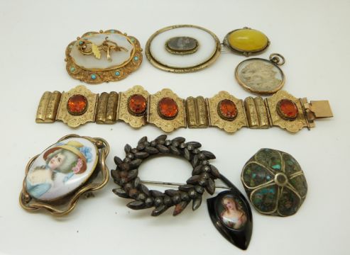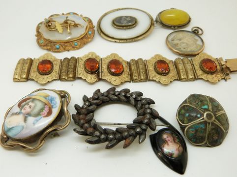 Two Victorian brooches, a Victorian gilt bracelet with foliate detail set with citrines, a cut steel brooch, other brooches etc