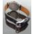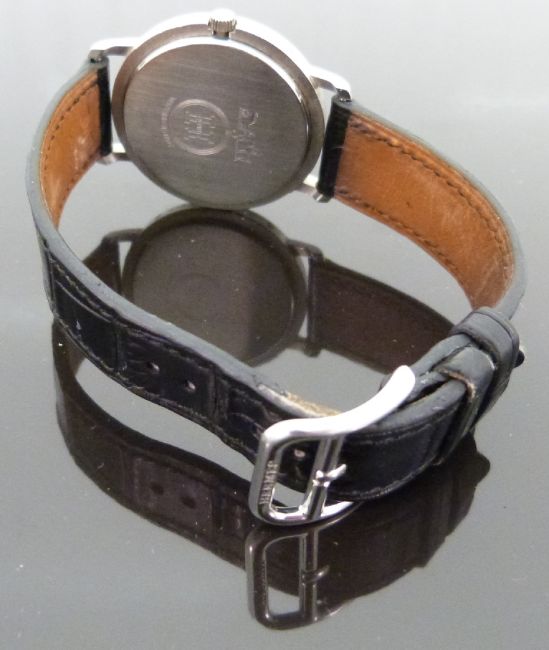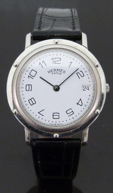 Hermes Clipper stainless steel gentleman's wristwatch with date aperture, black hands and Arabic numerals and white face, on black leather strap, case diameter 34mm