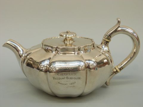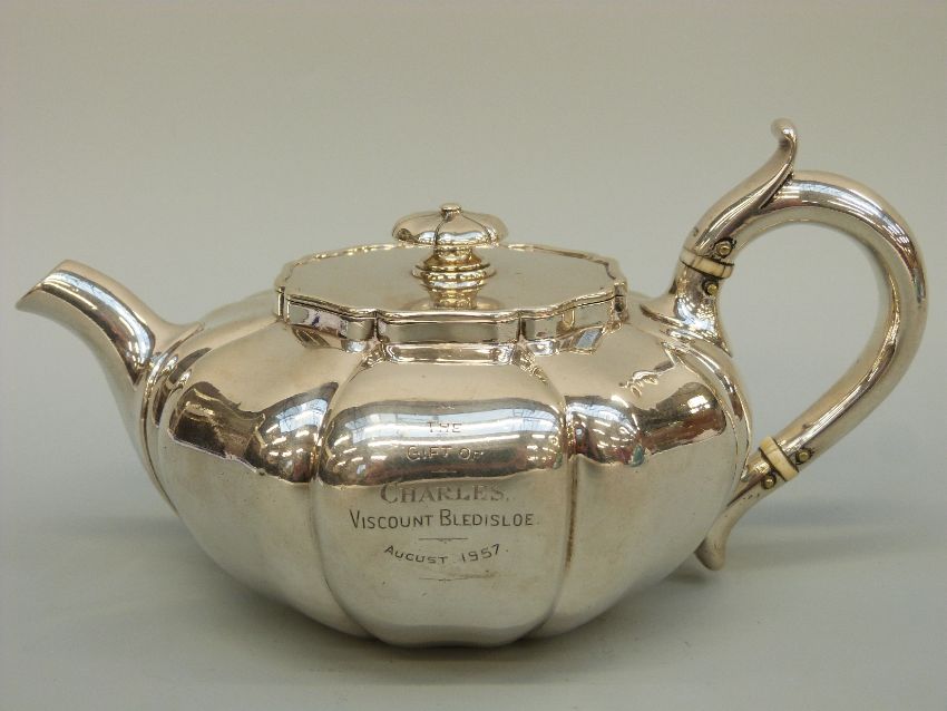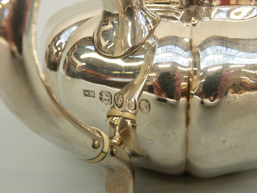 A Victorian hallmarked silver teapot of squat lobed form, London 1844 maker Walter Morisse, length 21cm, weight 556g all in