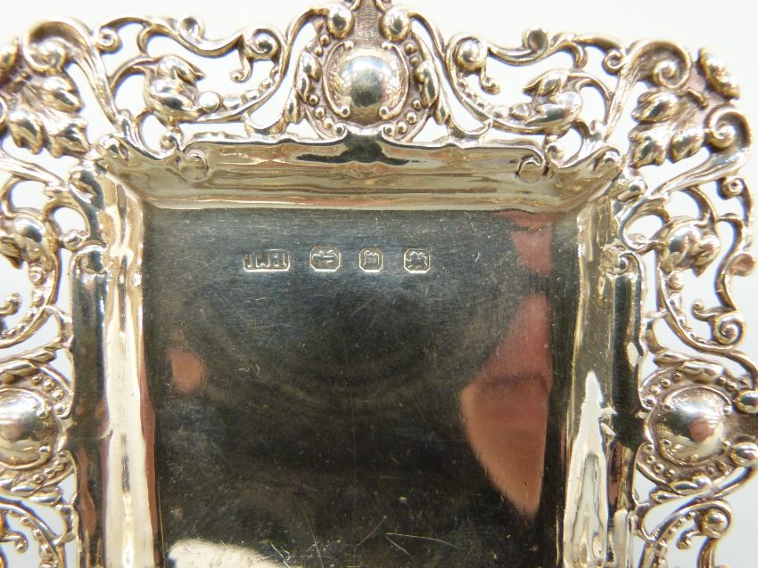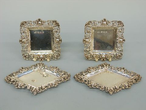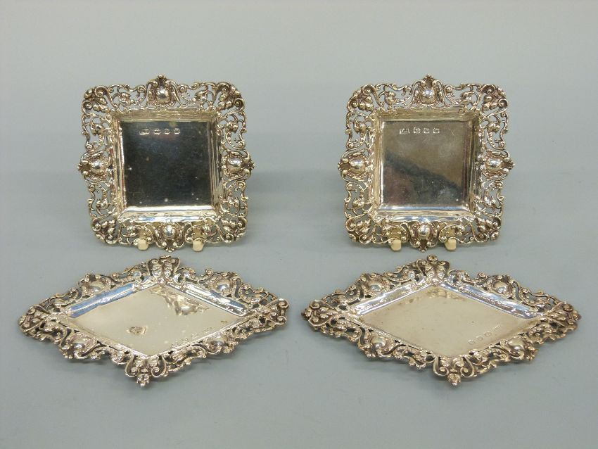 Two pairs of matching Victorian hallmarked silver pin dishes of square and diamond shape with pierced borders, Birmingham 1896 maker Thomas Hayes, length of diamond shaped examples 11.5cm, weight 108g