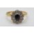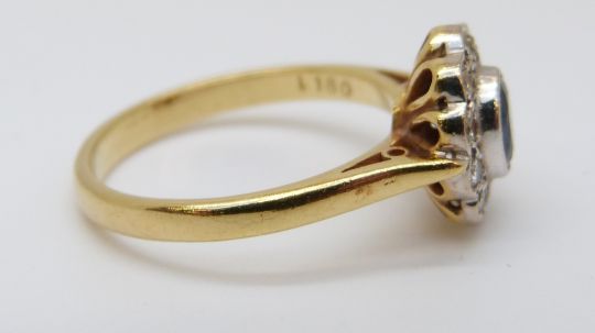An 18ct gold ring set with a sapphire surrounded by diamonds in a cluster (size K)