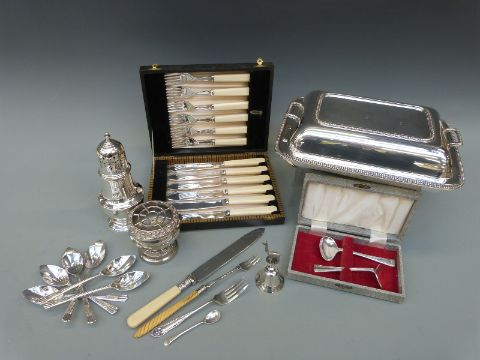 A quantity of silver plate to include entree dish, sugar caster, cased cutlery etc