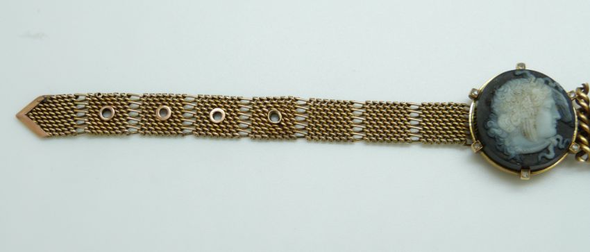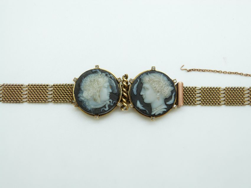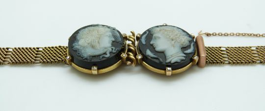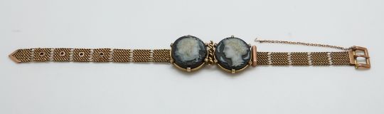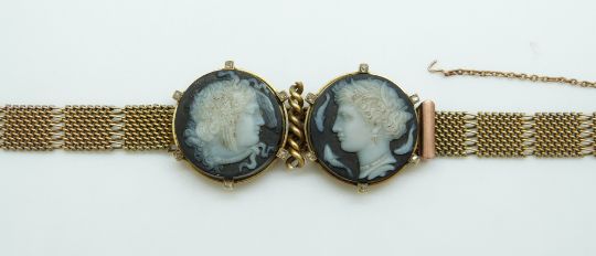 A 9ct gold Victorian bracelet set with two finely carved hardstone cameos depicting day and night, surrounded by rose cut diamonds, with buckle clasp