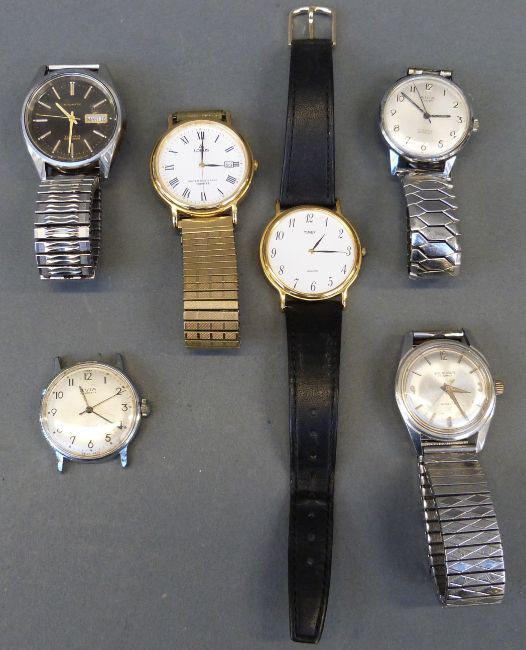 Six gentleman's wristwatches including Avia Cadet, Excalibur, Citizen automatic, Timex and Lorus.