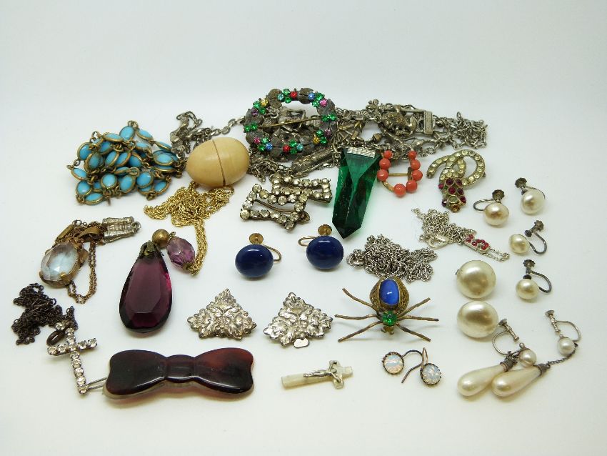A collection of jewellery in a tooled leather box including spider brooch, faux pearl earrings, paste necklaces and buckles etc