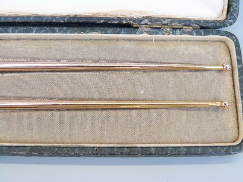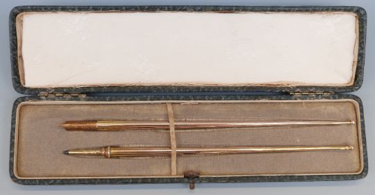 A cased yellow metal dip pen and pencil set, each marked 9ct, weight of both 8.9g all in, length 18cm