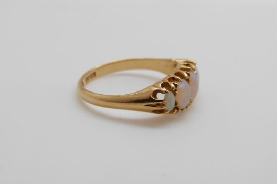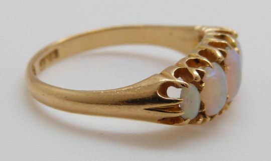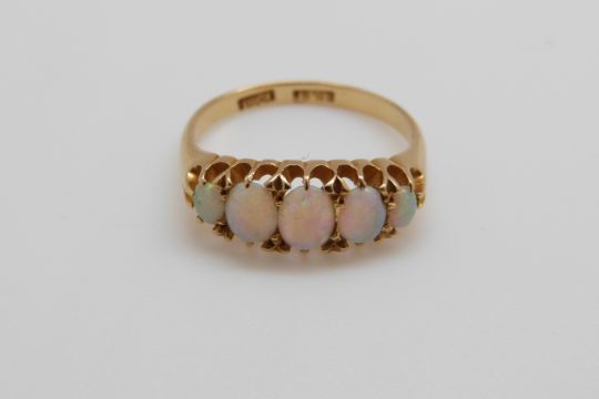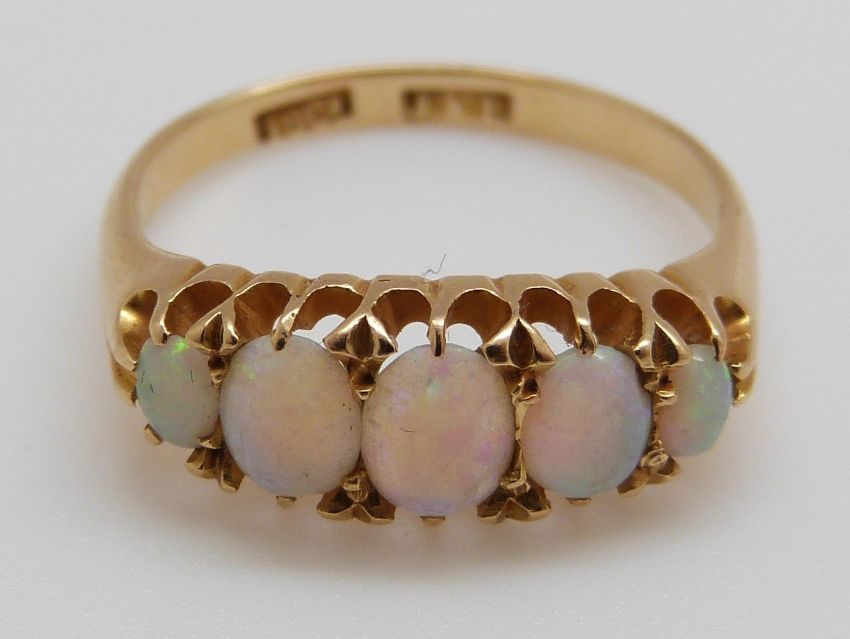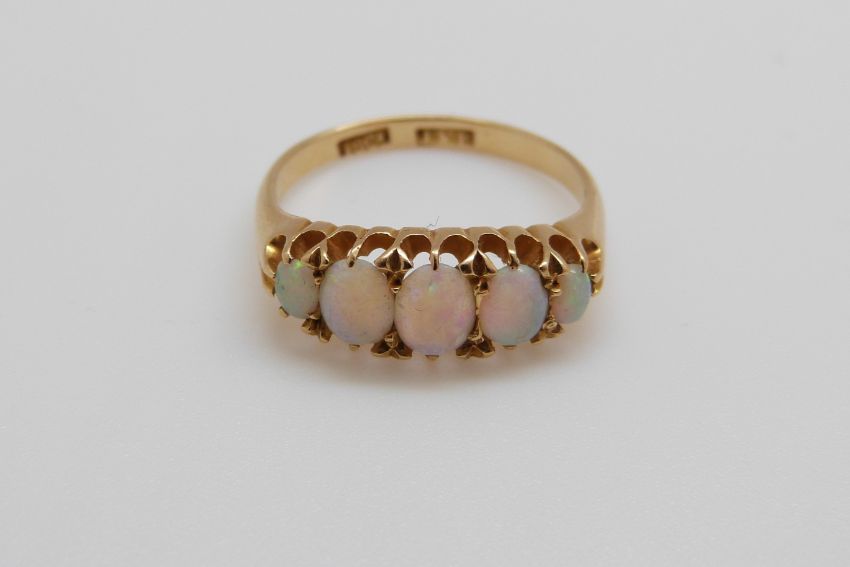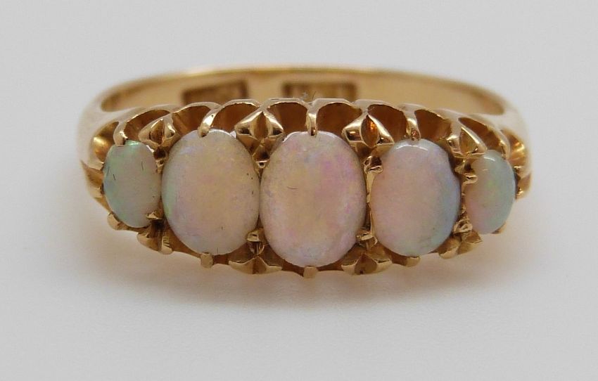 An 18ct gold ring set with five graduated opals, maker JFR (size M)