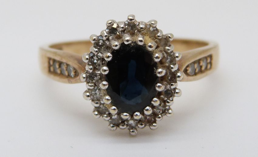 An 9ct gold ring set with a sapphire surrounded by diamonds (size O)